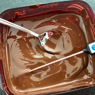 Temperatur messen: die etwas abgekühlte Schokolade gebe ich nun zum restlichen Drittel der flüssigen Schokolade und rühre beides gründlich zusammen. Die Schokolade sollte nun die optimale Temperatur von 30 Grad zum Verarbeiten haben.