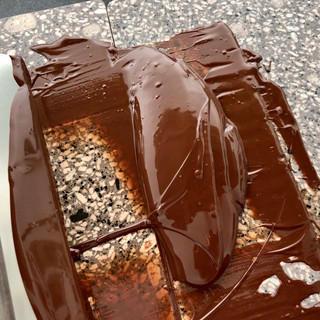 und gebe davon 2/3 der flüssigen Schokolade auf die glatte und kühle Marmor(Granit)Platte.