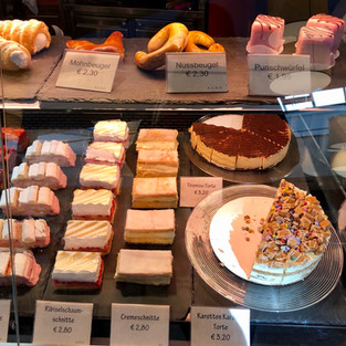 Ich bin durchaus positiv überrascht vom reichhaltigen Kuchen und Torten Sortiment in den Vitrinen.