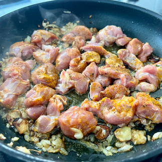 Das Kitz-Fleisch schneide ich in Würfel und würze es mit Salz und Pfeffer und einem Esslöffel Curry und brate es in der Pfanne mit dem Zwiebel gemeinsam weiter an.