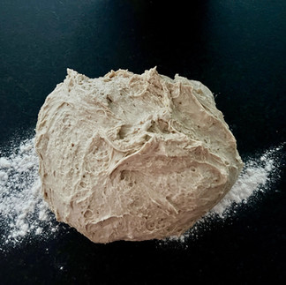 Den Teig kippe ich nun auf eine bemehlte Arbeitsfläche und falte diesen zu einer runden Laib-Form.
