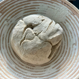 Meine Gärform bemehle ich, lege den Teig mit dem Verschluss nach oben rein, decke es mit Leinen ab und und lasse es eine weitere Stunde gehen.