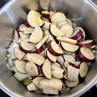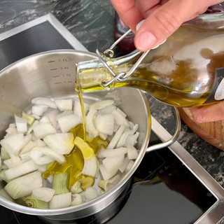 Die Zwiebeln schneiden wir grob und rösten diese im Olivenöl mit den Melanzani an.