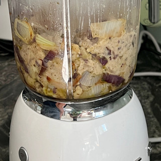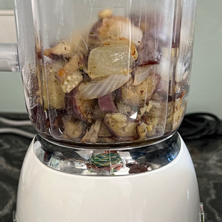 Nachdem sich die Röstaromen entwickelt haben, geben wir die Masse in den Blender und pürieren es.