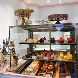 rechterhand Tortenformen, Zuckergüsse und diverse Artikel aus der Patisserie.