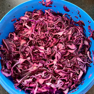 Das fein geschnittene Blaukraut vermenge ich mit Salz und Zitronensaft.