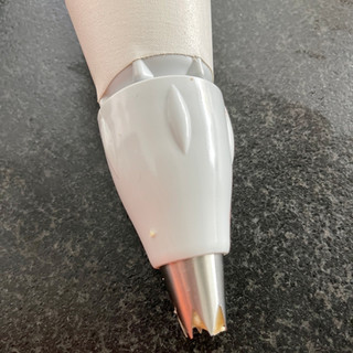 Den fertigen Teig gebe ich in einen Spritzsack mit Sterntülle und trage damit am Blech die Taler auf.