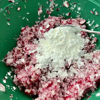 Meine Masse ist ziemlich klebrig, das passt aber genau so! Wichtig ist nur, dass die Radieschen wirklich gut ausgedrückt sind!