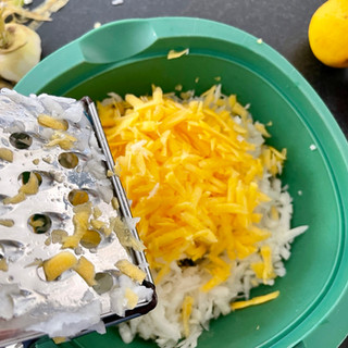 Zuletzt mische ich den Käse und das Gewürz dazu und forme dann die Laibchen.