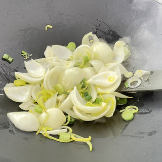Für die Spargelpfanne röste ich Zwiebel und Lauch kurz an, gebe dann GrünSpargel und braune Champignons, Zucchini, rote und gelbe Paprika dazu.